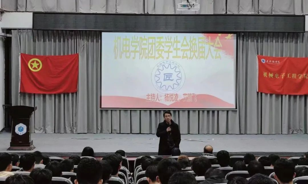 11月19日晚上19:30,我院于第二报告厅举行的第八届团委学生会换届大会顺利召开。参与此次大会的有机电学院党总支副书记毛鹏飞老师、团委书记郑涛老师、专职辅导员朱同老师、蔡琪老师和刘松波老师、机电团委学生会全体成员、机电学院21级各班班委及学生代表。