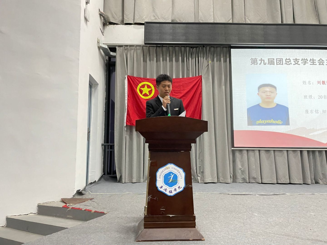 第九届团总支学生会主席刘靓强发表就职演讲。首先代表本届学生会发表对今后工作的打算和决心。而后指出会秉承“奉献校园,服务同学”的宗旨,努力成为同学和同学、同学和学院、同学和老师的桥梁和纽带。最后表达了对机电学生会的祝愿。