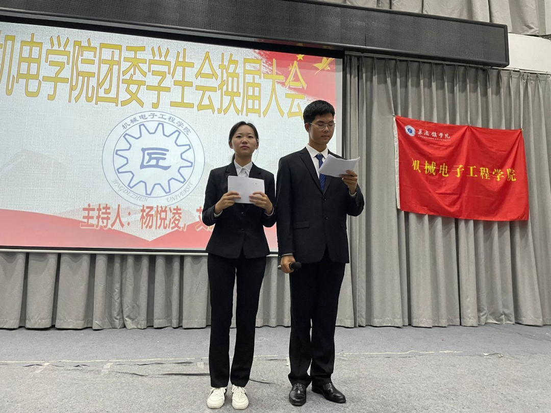 2021年是中国共产党建党一百周年!在这一百年里中国在共产党的带领下发生了日新月异的变化,国家蒸蒸日上。而我们机械电子工程学院也是在学生会的组织下节节高升,再创辉煌。至此,我们迎来了机械电子工程学院新一届的团委学生会换届大会。首先由主持人杨悦凌和艾鹏飞介绍大会议程。