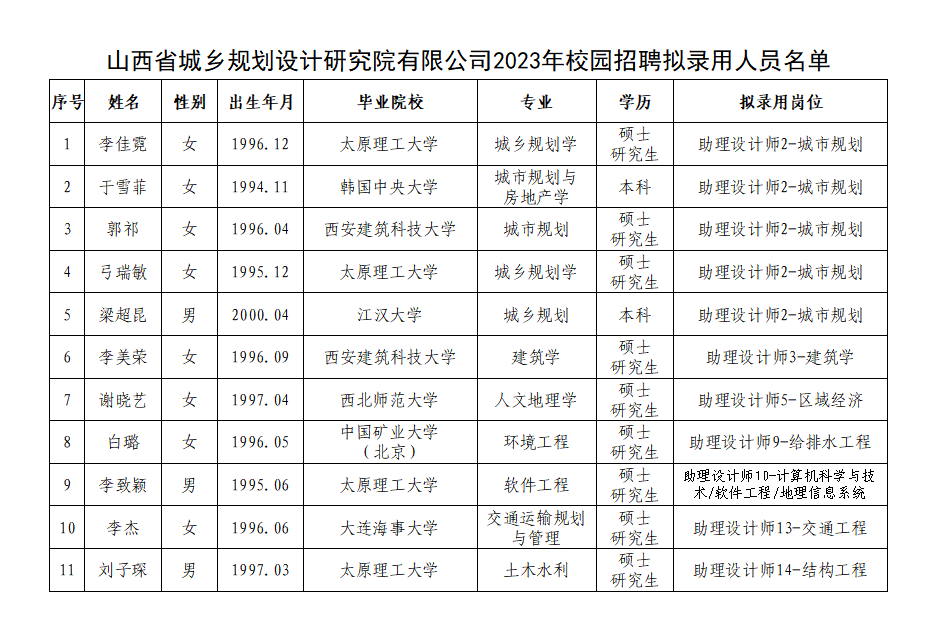 根据2023年7月28日《山西大地环境投资控股有限公司所属山西省城乡规划设计研究院有限公司2023年校园招聘公告》内容,经线上报名、人员初审、笔面试测评、体检等环节,拟录用11人,现将拟录用人员名单予以公示。