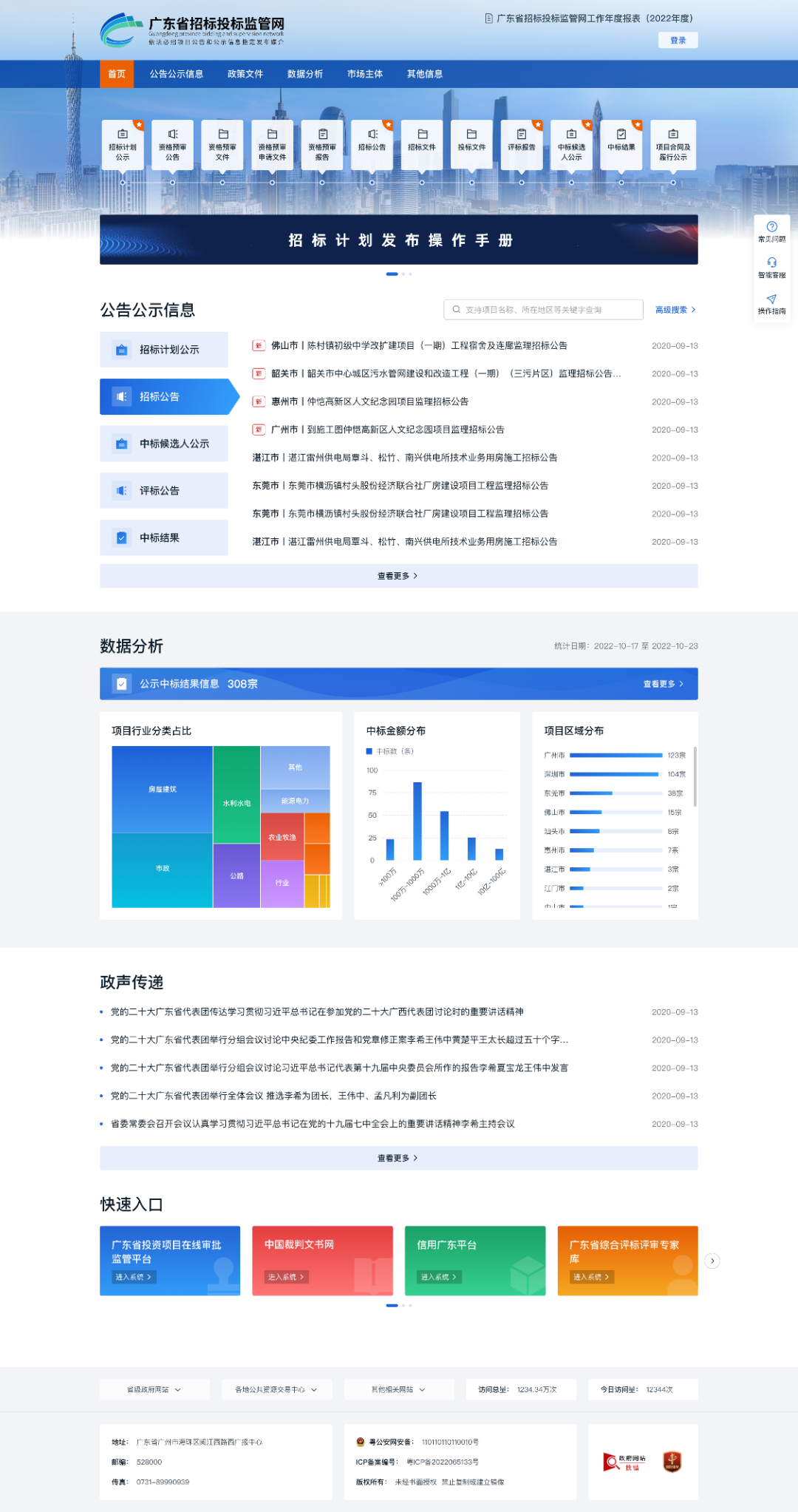 广东省招标投标监管网是我省依法必须招标项目招标公告和公示信息指定发布媒介,凡是本省依法必须招标的项目,必须按照规定统一在网站发布招标公告和公示信息。