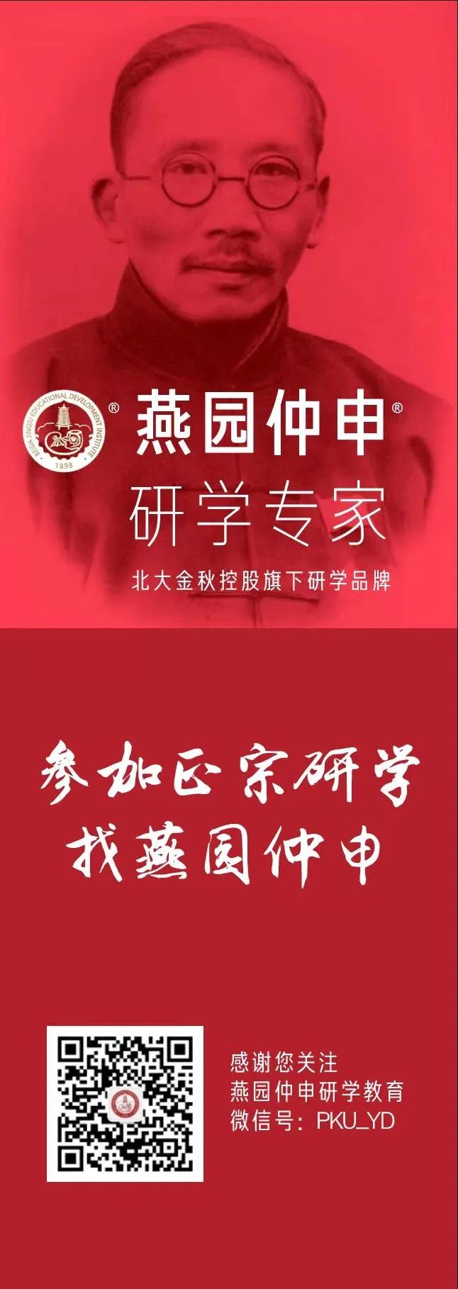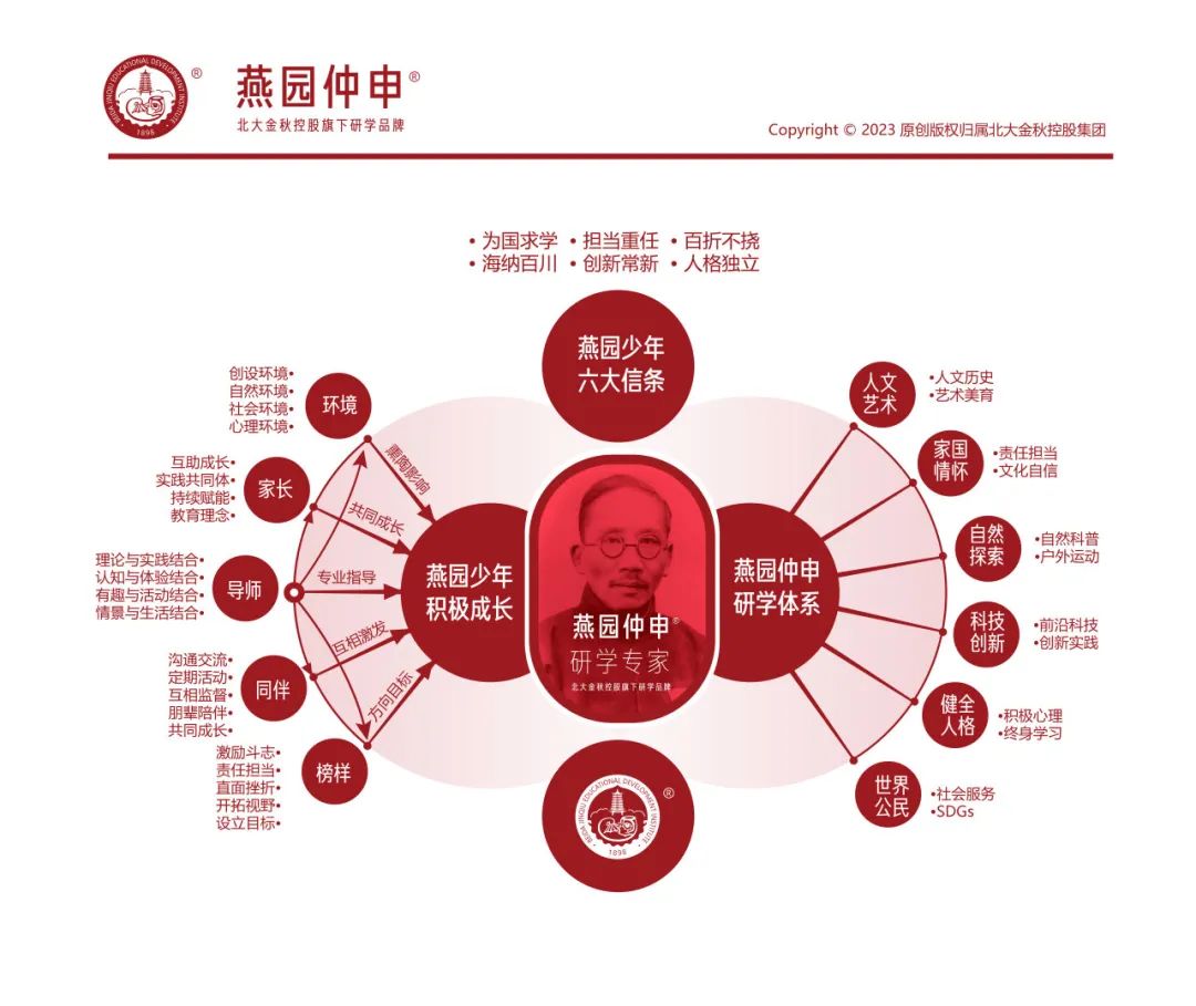 燕园仲申是北大金秋控股旗下的知名研学品牌,以北京大学老校长蔡元培的表字“仲申”为名,淬炼北大精神,弘扬传统文化,以“完全人格”作为教育追求,提倡德、智、体、美、世界观“五育并举”的教育体系,结合积极心理学之父马丁·塞利格曼教授的24项品格优势理论及北京大学校友、清华大学社会科学学院院长彭凯平教授的积极心理学“ACE”理论,依托北大金秋教育发展研究院前沿交叉学科的研究与应用,进行课题延伸、课程设计,导入情景训练,形成一整套先进、科学、符合儿童认知心理的研学体系,鼓励孩子成为人格独立、常为新的新一代北大精神传承者。