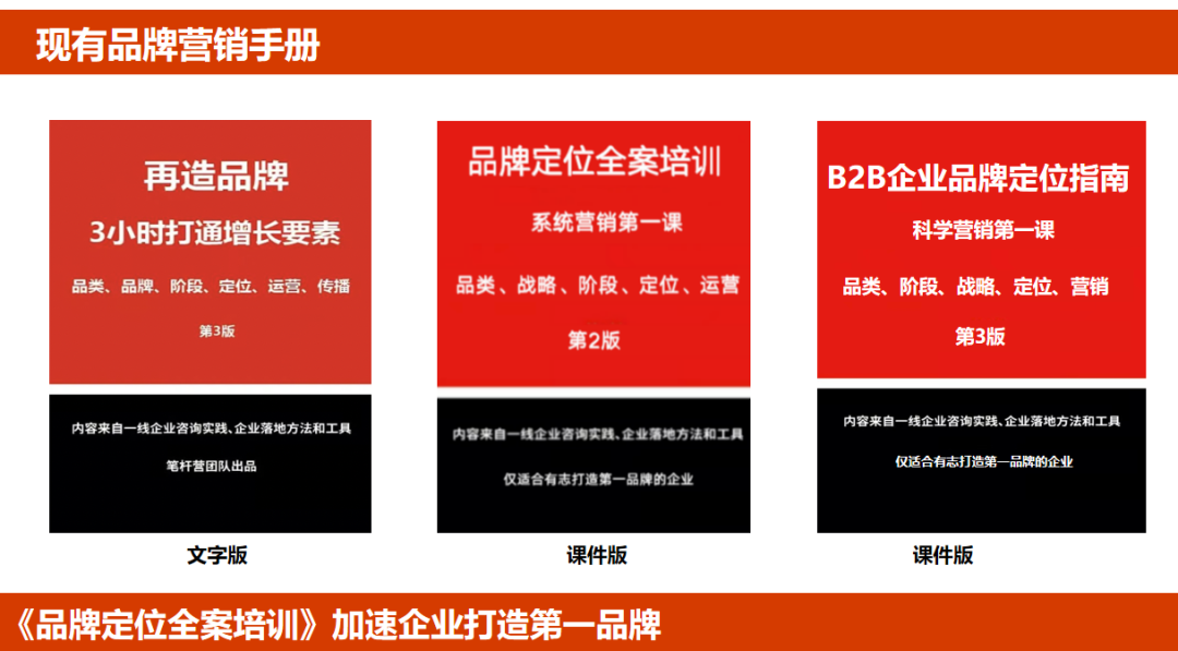 调研意识方面,欧美企业往往相对靠前。很多企业在日常经营并没有做足够的调研,尤其是营销调研。比如做广告、做策划、做内容营销,很多缺乏核心指向。传播是做了,但是只是曝光。很多公司即使请了咨询公司,但也只是让咨询公司单独调研,并没有在企业内部建立适合自身的调研体系。一方面有咨询公司的责任,另一方面很多企业并没有这样的意识,以为只要请咨询公司就行,让咨询公司去调研。一旦咨询公司不合作,企业难免过去被动。实际上企业需要建立自己的调研体系,即使不找咨询公司,或许也可以做常规调研、品牌定位调研。在最新最新版的《品牌定位全案培训》营销手册,我会给大家提供更多关于如何调研的内容。如果您需要升级品牌、需要优化广告、需要做重新定位,这本书一定值得一翻。比如需要针对哪一类顾客做调研,做品牌定位调研需要问哪些问题、如果做电话调研、如何做门店店员调研、为什么要找销售冠军调研。通过一天的内训分享,您除了可以了解到整个品牌定位全案体系,您也可以通过团队学习建立统一的品牌营销理念,更高效推进品牌落地定位。1、不只给到观念、做品牌全案的逻辑,为什么有时候做宣传不能只是强调产品、如何辩证看待符号派、定位派咨询公司,还会给到具体的方法,比如怎么找差异化、怎么做有效的广告、怎么做顾客调研、如何做电话调研;2、这场培训不只适合企业家,更适合品牌部同事,比如广告宣传怎么做、比如内容营销怎么做、品牌设计哪些是重点;3、针对企业当下的品牌现状,从战略到战术,从品类洞察、品牌地位、品牌定位分析再到符号、口号、营销系统分析品牌,找到适合企业的品牌提升方向。