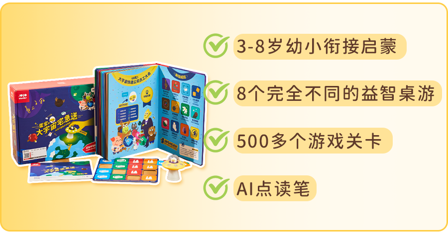 有了蛋宝,相当于有了 8 个完全不同的益智桌游+500 多个游戏关卡+AI 点读笔,真正实现让娃在玩中学、学中玩~