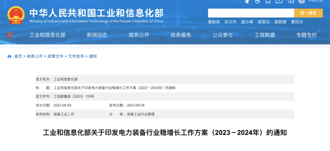 日前工业和信息化部印发电力装备行业稳增长工作方案(2023-2024年)的通知,通知指出: