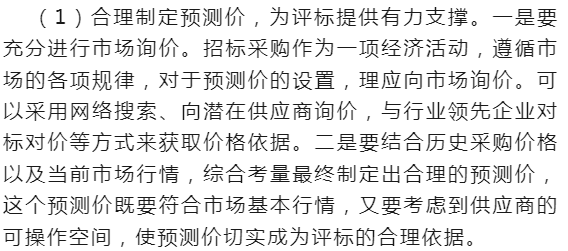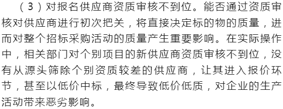 另一方面,机构设置完善,还要加强人员培训。首先是对招标从业人员的培训,培训内容除了包含招标投标法律法规、招标文件的规范编制以及规范操作等,还应强化供应链管理、企业管理等理念,帮助招标从业人员培养管理思维,立足企业发展做好招标工作。其次是对评标专家的培训,一是使其了解招标相关法律法规,帮助其树立法纪观念,以及严肃、端正的评标态度,二是使其熟悉了解评标原则,增强责任意识,提高专业素养,三是可以结合评标过程中不规范评标典型,如错判、漏判、滥用否决权造成招标失败的典型案例,有针对性地培训。充分发挥评标专家在招标评标过程中的重要作用,确保评标过程合规、公正。最后,还应强化对潜在供应商的培训,通过制定供应商操作手册和录制视频的方式,向潜在供应商介绍投标的具体操作防范和实用技巧,帮助供应商正确、高效投标,避免失误。