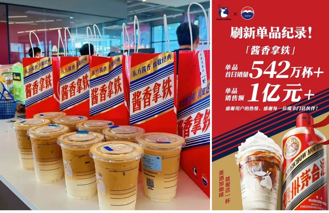 与瑞幸联名推出“酱香拿铁”,作为传统高端白酒品牌的茅台既实现了大众化,又连接到了年轻人。