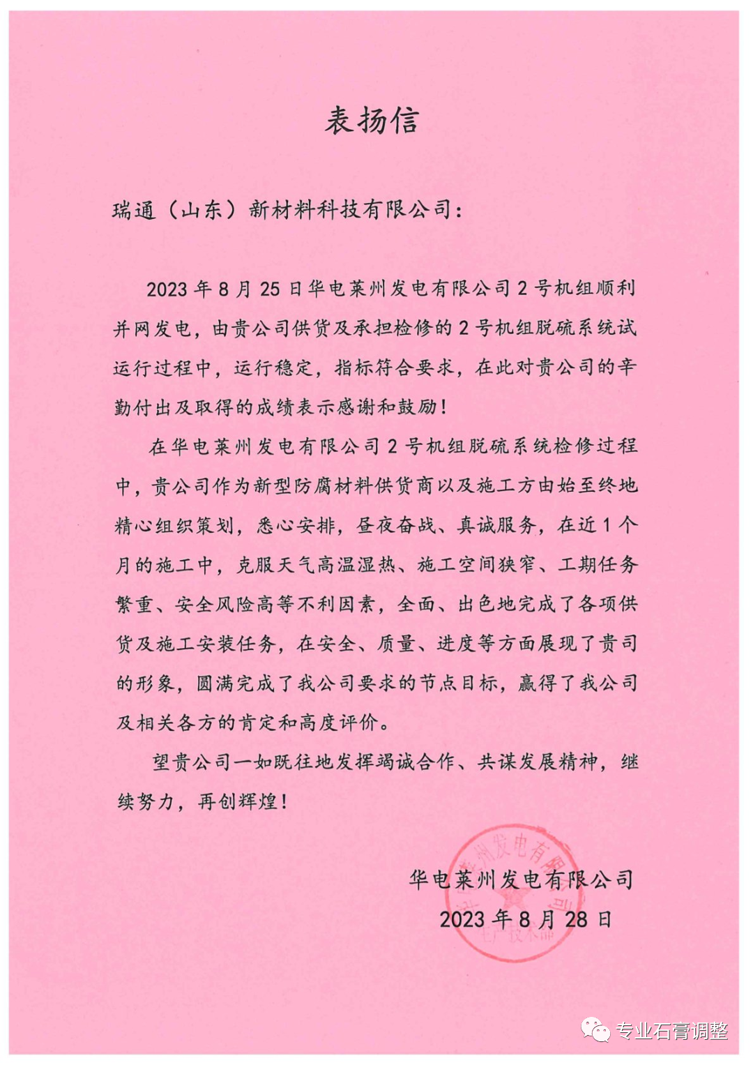 2023年8月28日,公司收到了华电莱州项目的表扬信,这封信中提出了瑞通山东新材料科技有限公司人员面对高温湿热天气,昼夜奋战,全面、出色地完成了华电莱州有限公司2号机组的各项供货及检修安装任务,顺利并网发电,在试运行过程中,运行稳定,指标符合要求。对我们各方面的肯定以及高度评价,但我们最感谢的是我们公司这群可爱的人。