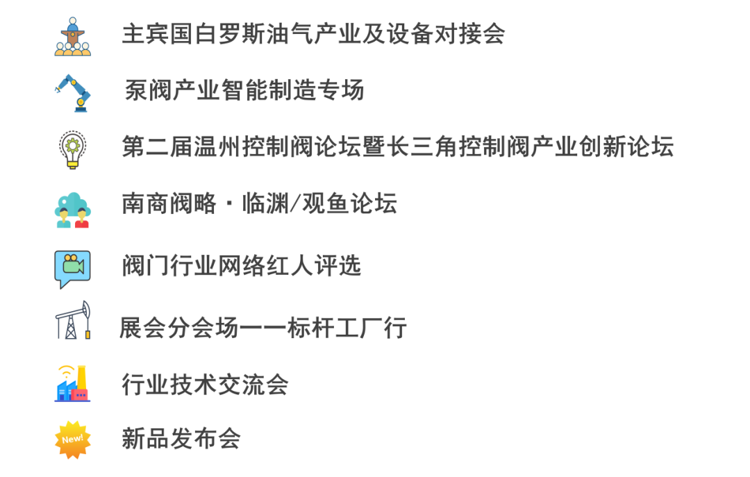 2023温州国际泵阀展将以“展+会”的融合新模式,同期举办展览、峰会、技术论坛、行业研讨会等多场特色活动,汇聚政府领导、院士专家和企业领军人物,聚焦行业热点及痛点,展示泵阀产业多领域的技术交流、创新成果,助力参展商紧抓更多行业新机遇,打造产业风向标!
