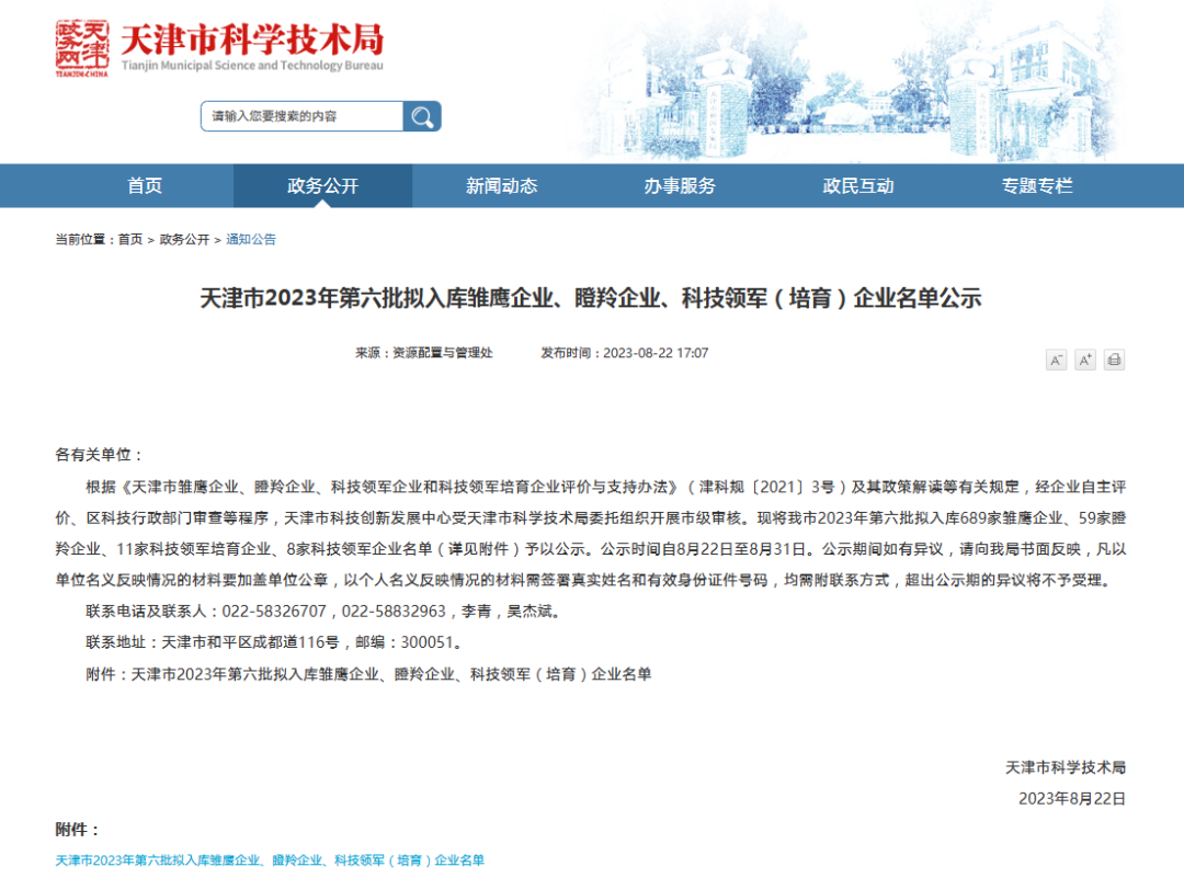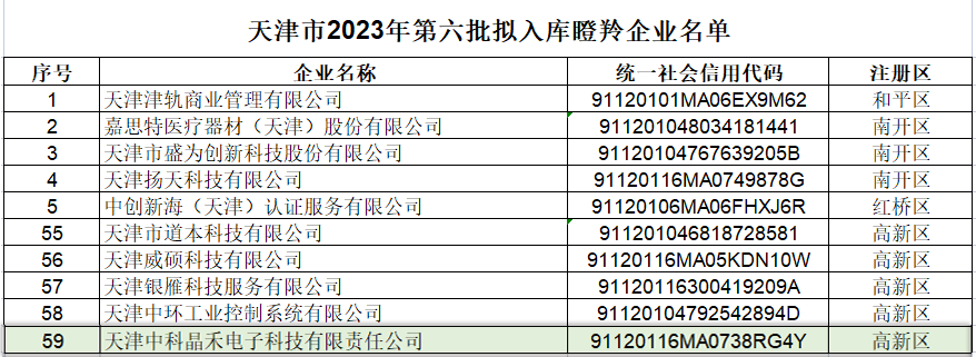 近日,天津市科学技术局对《天津市2023年第六批拟入库雏鹰企业、瞪羚企业、科技领军(培育)企业名单》进行了公示,其中,天津中科晶禾电子科技有限责任公司成功入选天津市瞪羚企业名单。