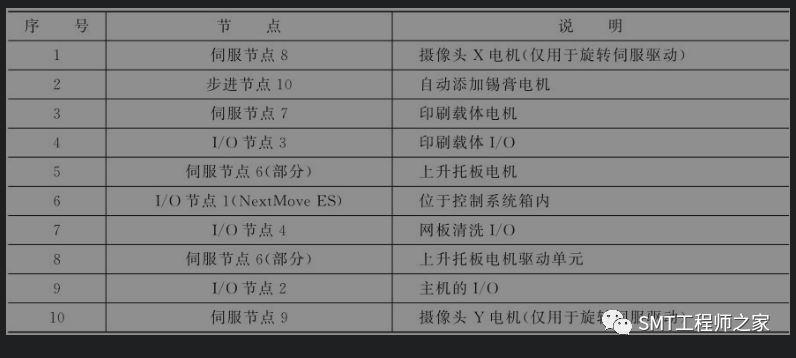 下表中所示的是DEK印刷机的控制系统节点说明。