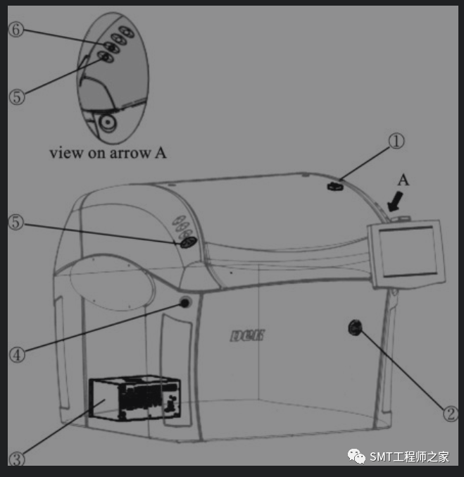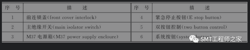 (1)如下图所示的是锡膏印刷机的正面视图,其中③指示的是M37电源箱,序号的指示如下表所示。