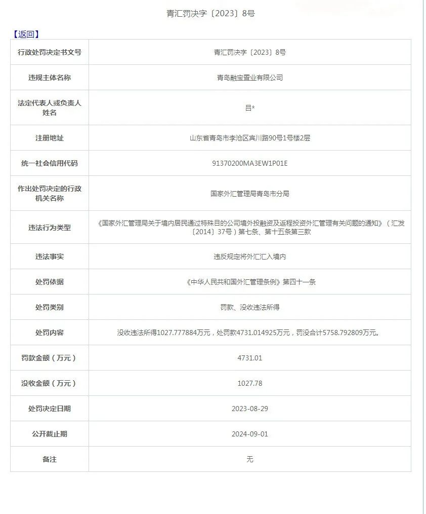 近日,国家外汇管理局青岛市分局发布一张巨额罚单,因违反规定将外汇汇入境内,一企业没收违法所得1027.777884万元,处罚款4731.014925万元,罚没合计5758.792809万元。