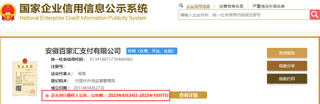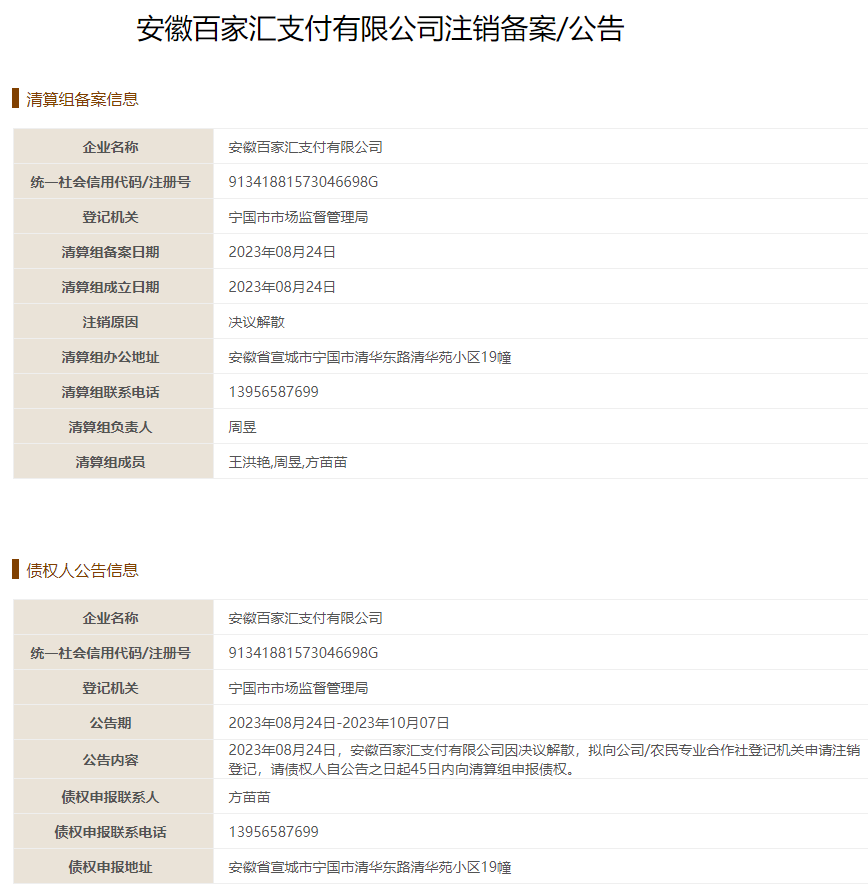 债权人公告信息显示,2023年08月24日,安徽百家汇支付有限公司因决议解散,拟向公司/农民专业合作社登记机关申请注销登记,请债权人自公告之日起45日内向清算组申报债权。