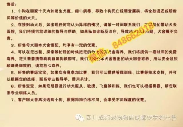 1、狗狗售出《半年》以内有任何问题可换同等品质狗狗(每只狗狗的售后服务都可签协议书保证,有法律效果)