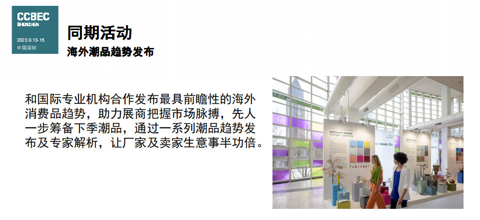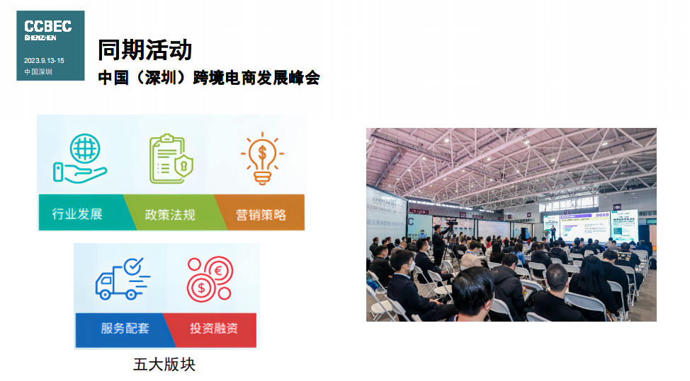 中国(深圳)跨境电商展览会(CCBEC)作为国内规模最大的跨境电商展会之一,集结多品类的优质供应商,同时汇聚海内外知名电商平台和服务商,为广大外贸和制造业企业提供全面而高效的出海平台。与此同时,展会汇聚了海内外的电商平台、服务商,为与会人士提供了大量的商贸资源。除了为业内人士创造大量商机,展会也提供丰富的同期活动,覆盖行业发展、政策法规、营销策略、服务配套以及投资融资五大板块,聚焦行业的最新资讯及需求。