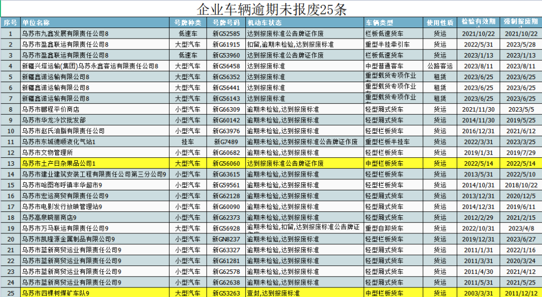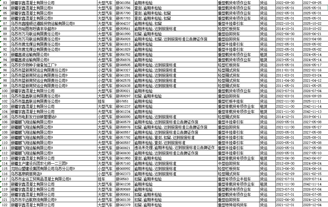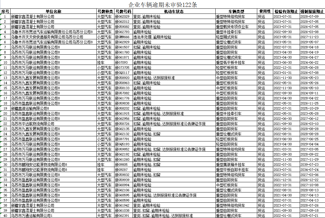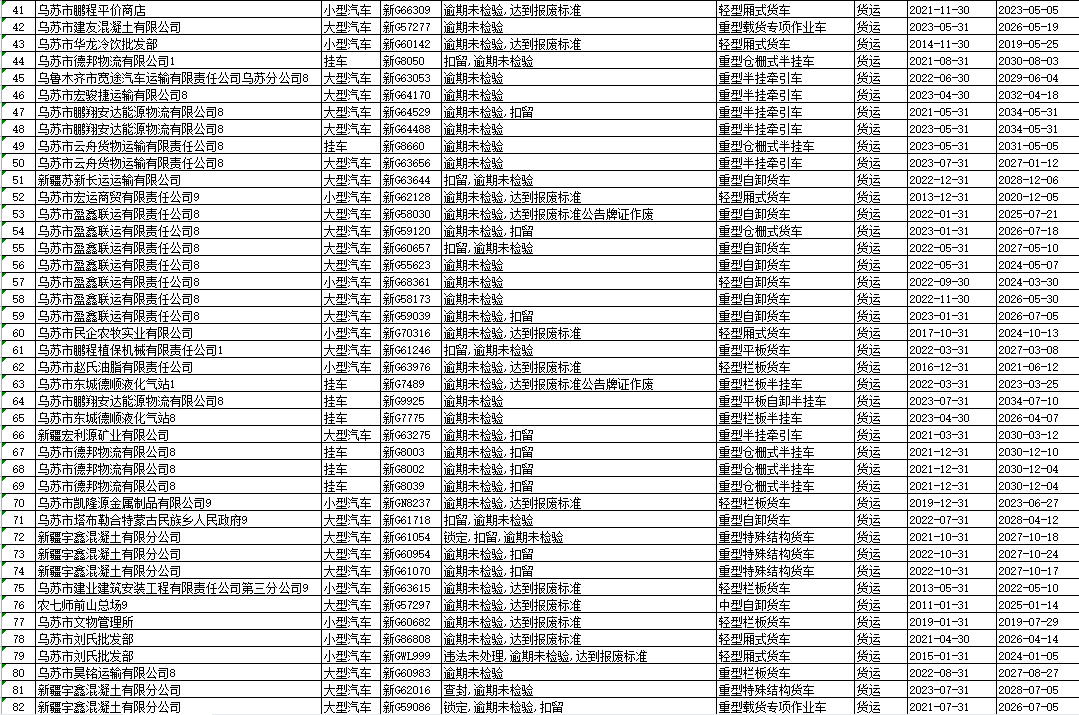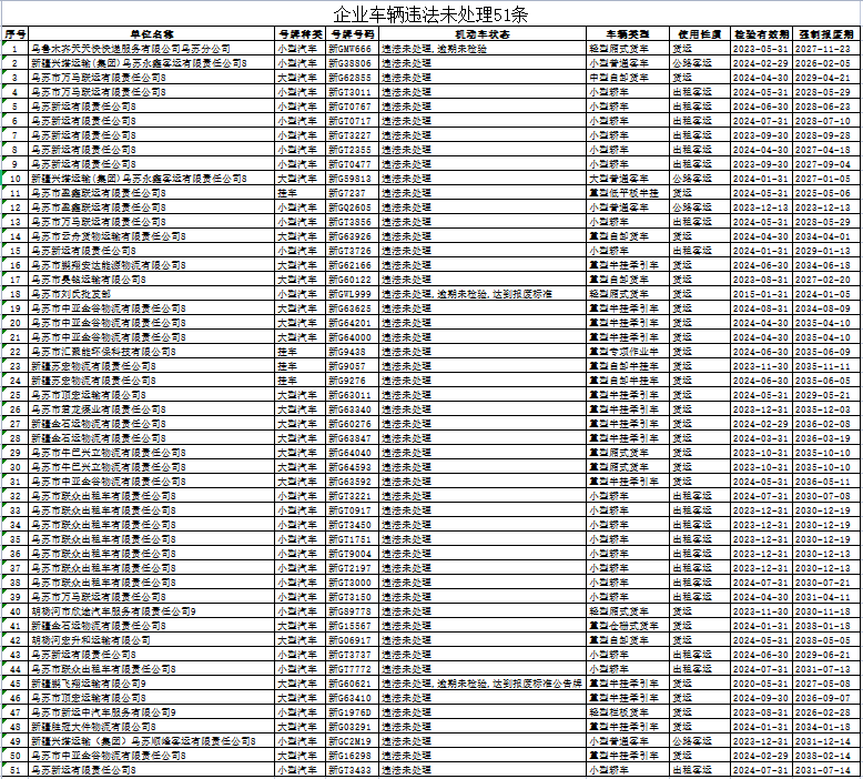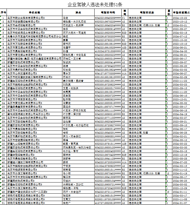 为确保辖区重点企业车辆和驾驶人隐患排查治理工作顺利开展,强化事故预防源头管理工作,切实提升隐患“清零”整体水平,为“减量控大”交通安全管理工作奠定基础。乌苏市公安局交警大队现将以下51辆重点运输企业车辆违法未处理、25辆重点运输企业车辆逾期未报废、122辆重点运输企业车辆逾期未审验、51位重点运输企业驾驶人违法未处理及信息及所属企业予以曝光。请以下重点运输企业所属驾驶人尽快到乌苏市公安局交警大队车辆管理所办理相关业务。