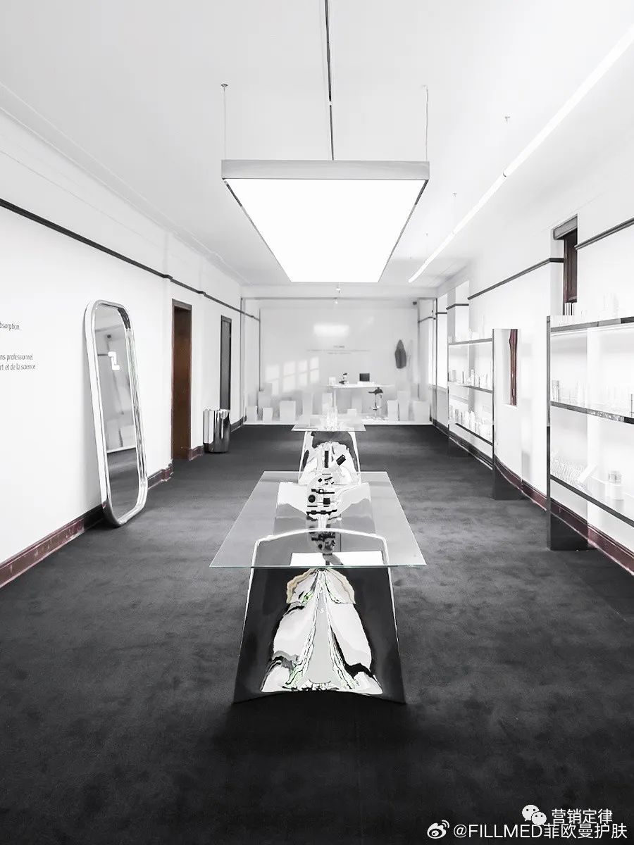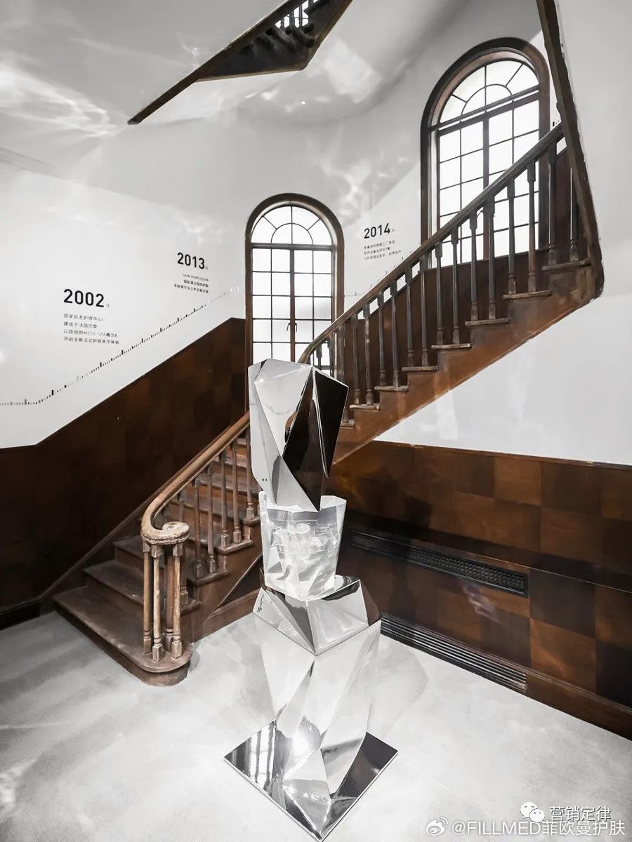 展览通过沉浸式观览和空间内多件装置艺术作品向公众展示来自法国护肤实验室的FILLMED 菲欧曼:展品 GAZE TIME 凝视时光的水晶中凝结着 21 分钟肌肤灌注组合产品,传达了「时光凝驻」的理念;「逆生长」之树体现了菲欧曼对于时光的认知;由菲欧曼精华串联成的时间之线,在光影中投射出了品牌的标志性元素——刻度等等。