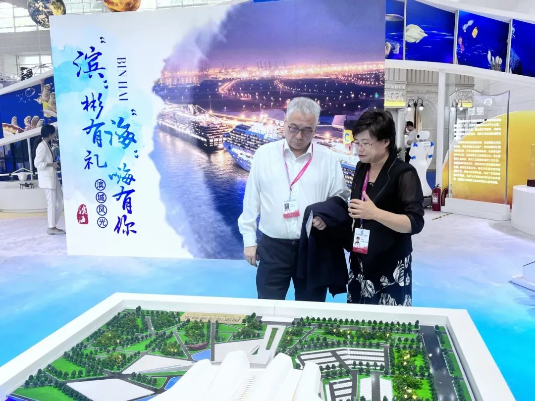 天津市滨海新区文化和旅游局局长贺淑荣与刘淄楠博士参观展区