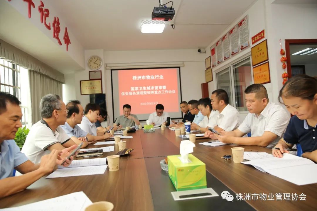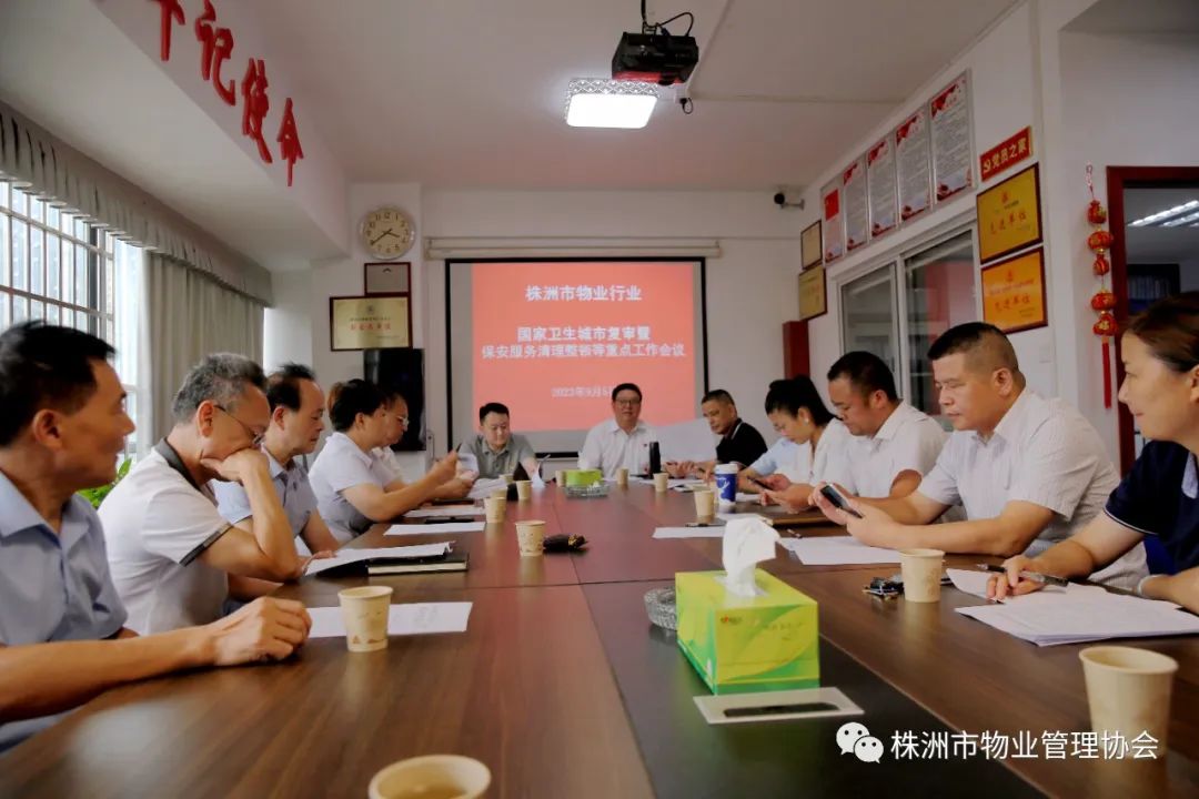 2023年9月5日下午,株洲市物业管理行业国家卫生城市复审暨保安服务清理整顿等重点工作会议在市物协会议室召开。市住建局物业事务中心副主任张志刚、市物业管理协会会长马文新,执行会长凌邦军、黄鹏、龚檐玲,各片区组长、市物协保安专业委主任单位代表李文凤及市物协执行秘书长雷蕾、副秘书长沈娜、刘维共计二十余人参加会议。