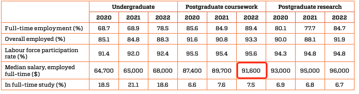 根据「澳大利亚政府教育部」2022年发布的最新「毕业生收入调查报告(COS)*」所知:2022年研究生就业情况明显改善,全职就业率从2021年的84.9%上升至89.4%,不仅比本科毕业生全职就业率高出4.7%,且全职收入中位数已超过9万澳币每年。