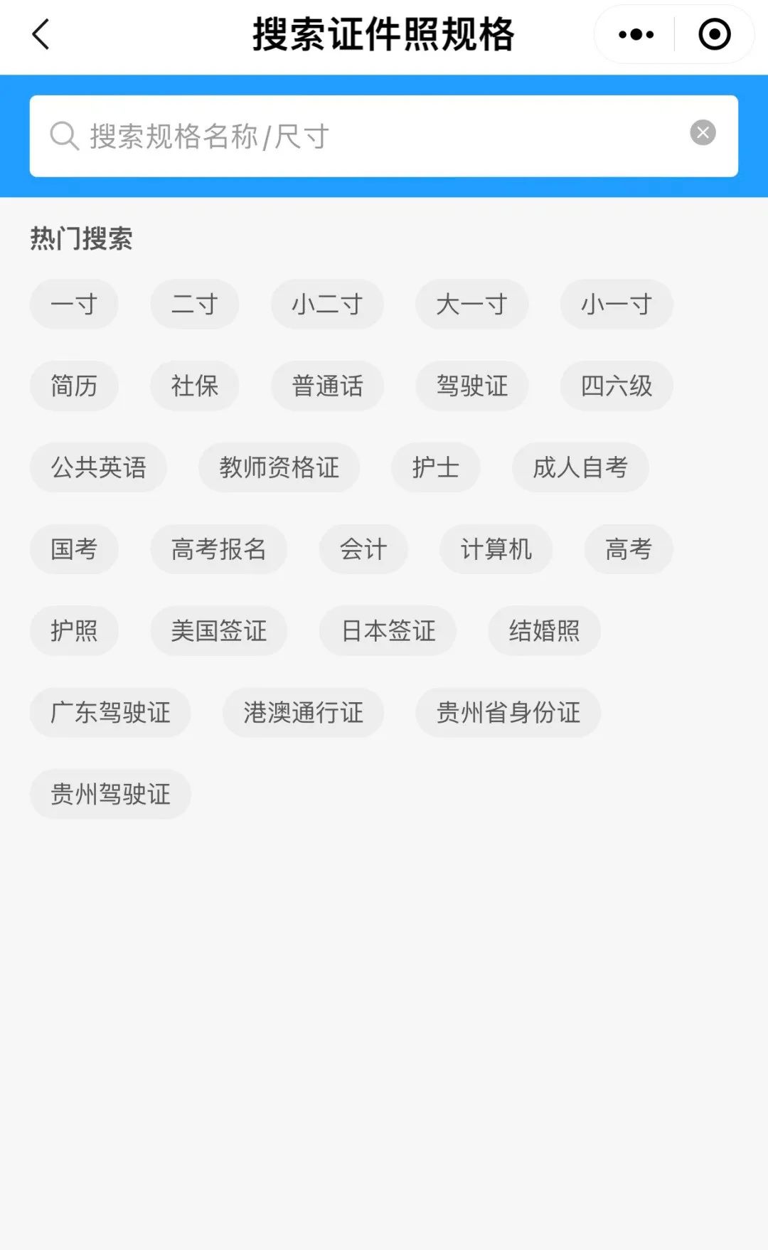 热门证件照,点击页面下方热门证件照,里面除了有常用寸照以外,还有身份证、驾驶证、社保证、简历、普通话水平测试、英语四六级、教师资格证选项等。
