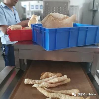 微波猪皮膨化设备生产制作过程:选取猪皮-浸泡清洗-踢出脂肪-猪皮造型-微波膨化-进行分装。