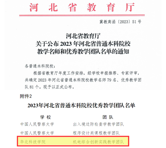 近日,河北省教育厅下发《关于公布2023年河北省普通本科院校教学名师和优秀教学团队名单的通知》(冀高教函〔2023〕51号),依托我校应急装备学院申报的“机电综合创新实践教学团队”获评2023年度河北省优秀教学团队。