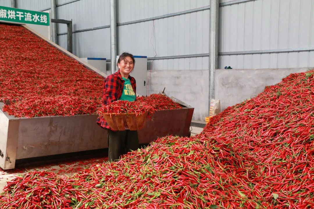 乡亲们种植辣椒积极性如此高,除了辣椒本身见效快、效益好之外,还与该镇的辣椒烘干厂密切相关。2021年,该镇修建了一个辣椒烘干厂,并将厂房承包给了沿河权望生态农业开发有限公司,该公司每年负责全镇的辣椒回收和加工工作。今年,辣椒迎来了大丰收,平均每天收购鲜辣椒3万多斤。