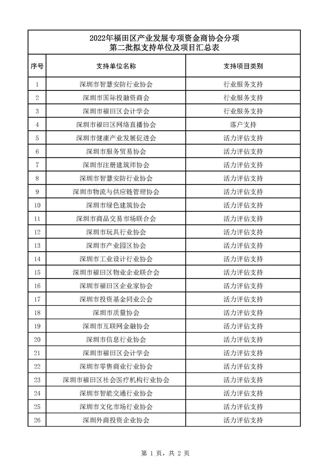 根据《深圳市福田区产业发展专项资金管理办法》及《深圳市福田区支持商协会发展若干措施》的规定,经审议,拟对以下单位及项目(详见附件)给予支持。现予以公示: