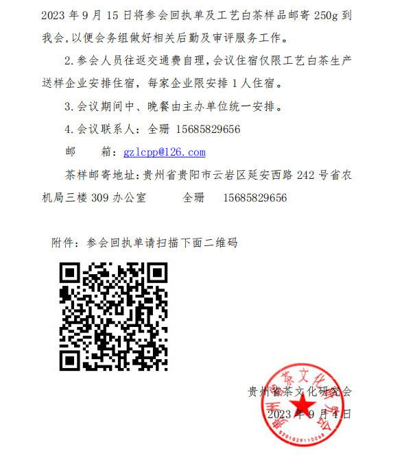1.诚挚邀请工艺白茶生产企业参会,有意参会企业请于2023年9月15日将参会回执单及工艺白茶样品邮寄250g到我会,以便会务组做好相关后勤及审评服务工作。