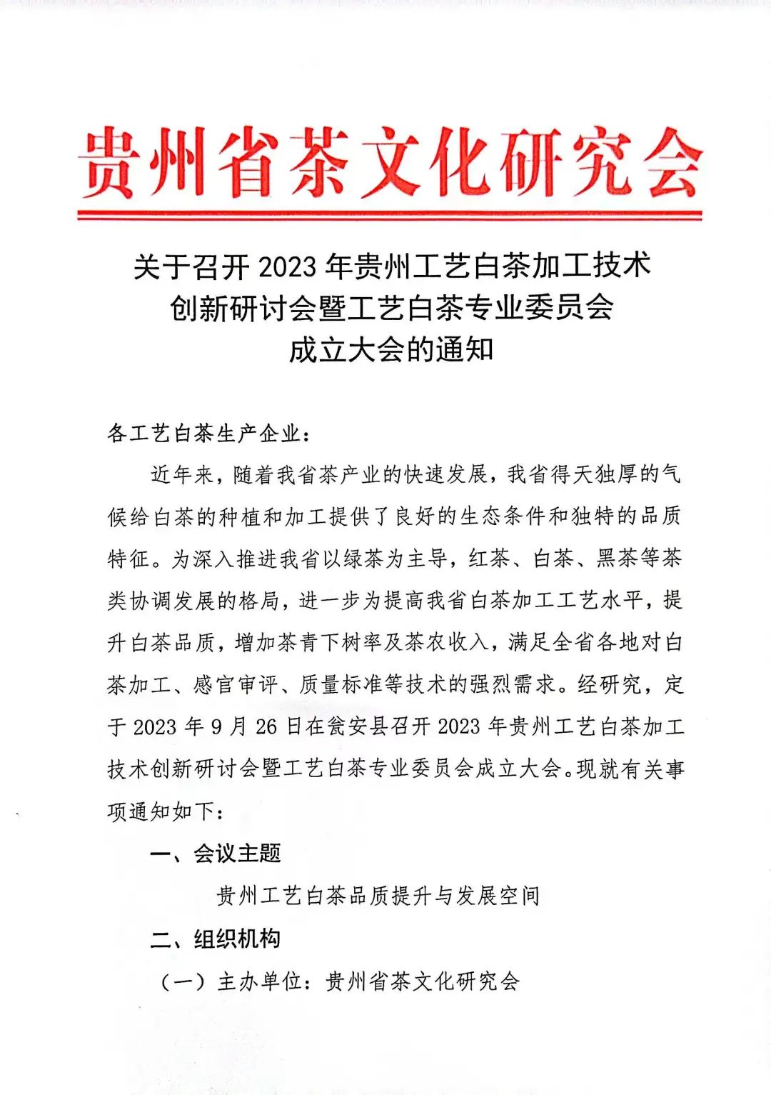 近年来,随着我省茶产业的快速发展,我省得天独厚的气候给白茶的种植和加工提供了良好的生态条件和独特的品质特征。为深入推进我省以绿茶为主导,红茶、白茶、黑茶等茶类协调发展的格局,进一步为提高我省白茶加工工艺水平,提升白茶品质,增加茶青下树率及茶农收入,满足全省各地对白茶加工、感官审评、质量标准等技术的强烈需求。经研究,定于2023年9月26日在瓮安县召开2023年贵州工艺白茶加工技术创新研讨会暨工艺白茶专业委员会成立大会。现就有关事项通知如下: