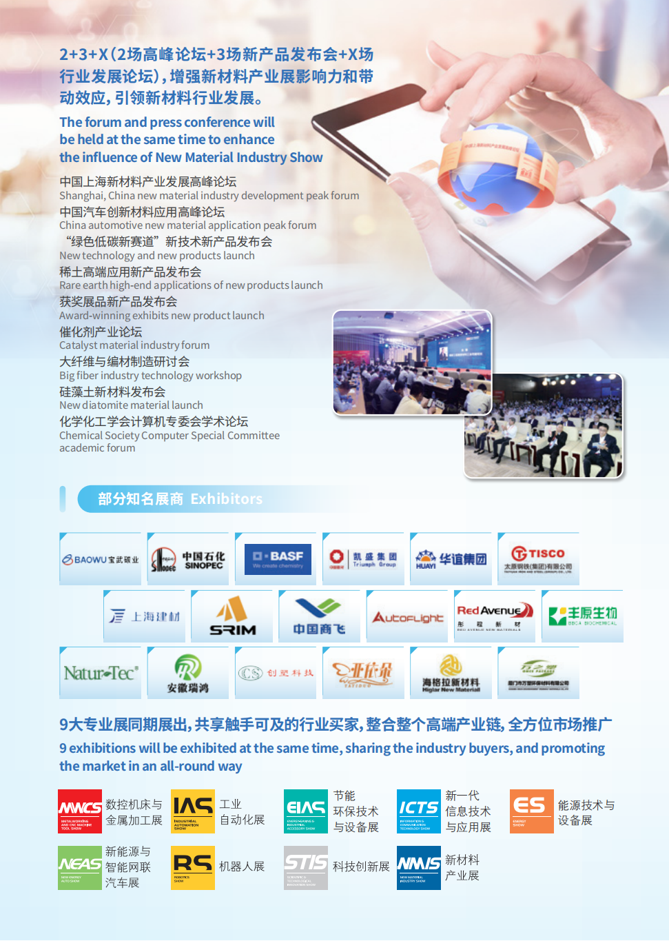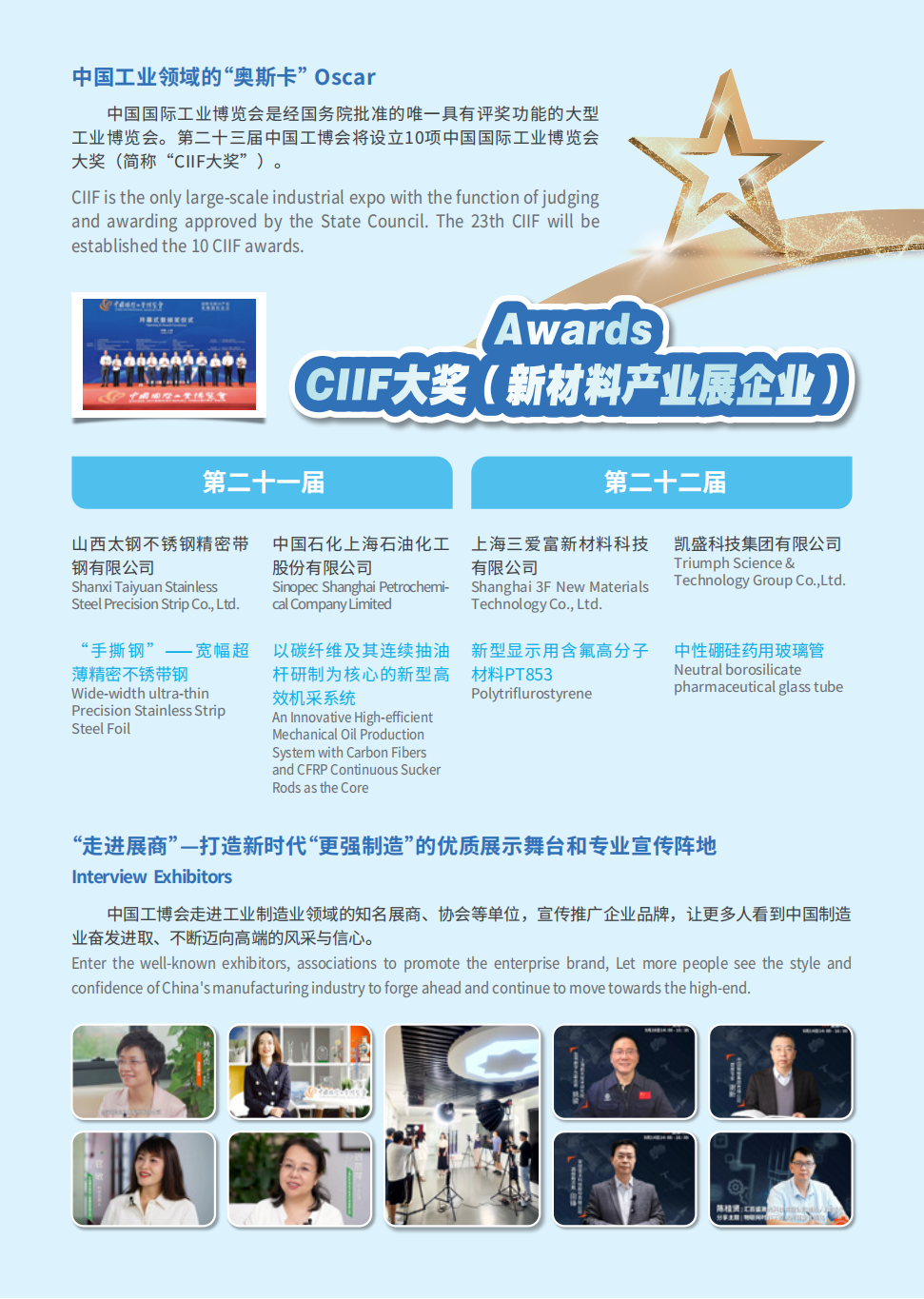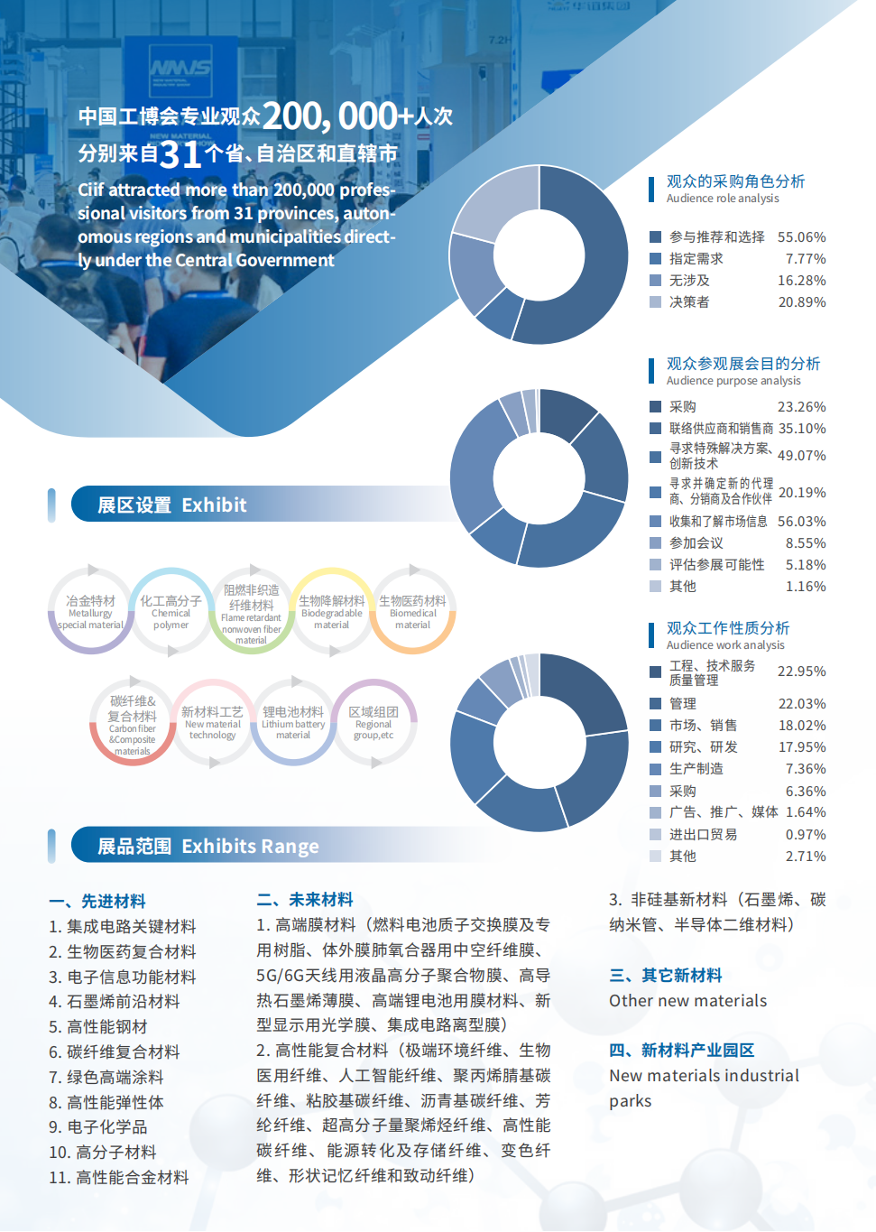 本届工博会在7.2 H馆设置了新材料产业展,新材料产业展作为中国工博会专业展,主要围绕新一代信息技术、高档数控机床和机器人、航空航天装备、节能与新能源汽车、海洋工程装备及高技术船舶、先进轨道交通装备、电力装备、生物医药及高性能医疗器械等高端制造领域配套材料和石墨烯、高温超导等前言材料进行技术交流、经贸协作等。