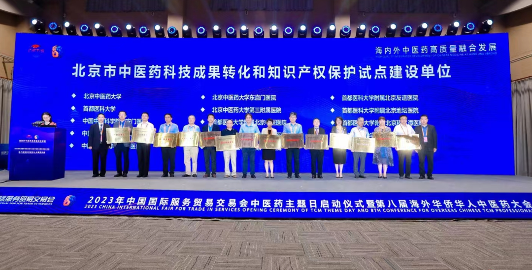 会议还为北京市中医药科技成果转化和知识产权保护的14家试点建设单位、4家试点建设基地,国际医疗服务联盟单位,海外中医药教育共建共享联盟单位、海外华侨华人中医药“百人百项”展示项目、海外华侨华人中医药四季大会轮值主席授牌,为5名北京中医药健康文化旅游使者代表颁发绶带。