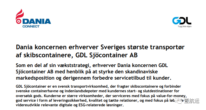 Dania在公告中表示:“根据计划中的所有权变更,Dania集团收购了GDL Sjöcontainer 100%的股份,这遵循了计划中的增长战略。”