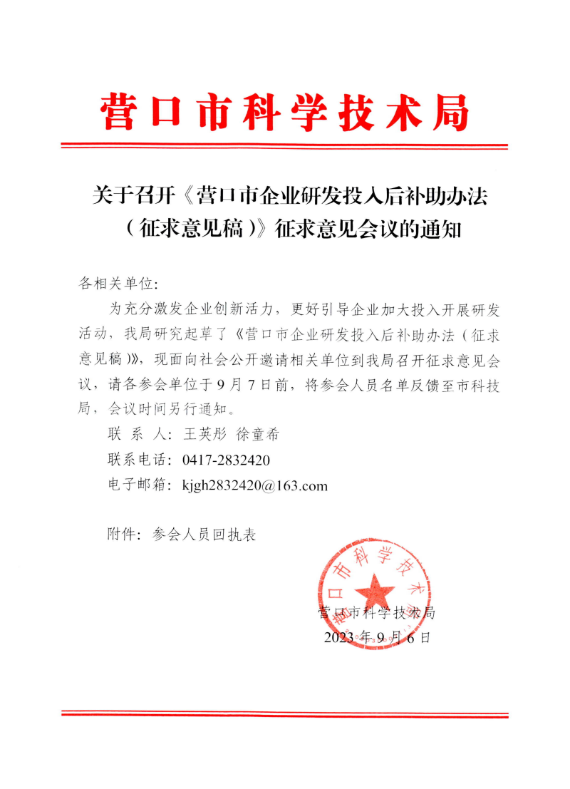 营口市科技局 | 关于召开《营口市企业研发投入后补助办法(征求意见稿)》征求意见会议的通知