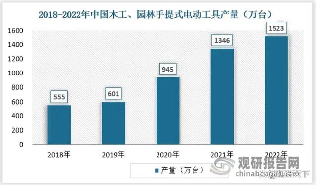 2022年我国木工、园林等用手提式电动工具产量达到1523万台。