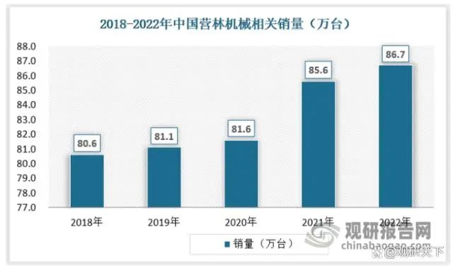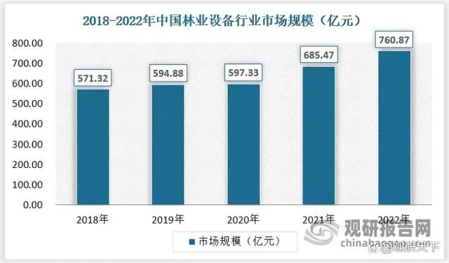 自20世纪90年代中期,随着中国政府推动生态文明建设、天然林保护政策、林业重点生态工程建设、建立以国家公园为主体的自然保护地体系、实施“山水林田湖草沙”系统治理项目、将林业碳汇纳入全国碳市场等一系列重大政策和战略措施,中国在森林治理和保护方面取得了显著成效,森林面积、森林覆盖率和森林蓄积量保持持续增长。特别是党的十八大以来,中国更加注重科学国土绿化,从追求数量为主到质量与数量并重,森林覆盖率由21.63%提高至24.02%,人工林面积继续稳居世界第一,对遏制全球森林面积下降和减缓全球变暖发挥了重要作用。因此在“双碳”政策和建设生态文明社会的背景下,我国林业设备行业市场规模不断扩大。2018-2022年我国林业设备行业市场规模从571.32亿元增长至760.87亿元。复合增长率达到8.75%。