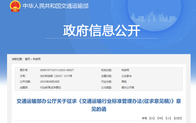 日前,为加强交通运输行业标准的规范化管理,提高标准制修订工作质量与效率,根据《中华人民共和国标准化法》《行业标准管理办法》《交通运输标准化管理办法》有关规定,交通运输部组织编制了《交通运输行业标准管理办法(征求意见稿)》面向社会公开征求意见。全文如下: