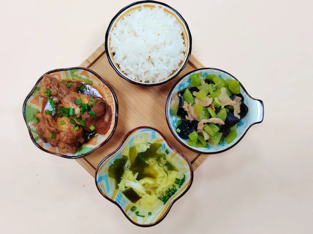 莴笋木耳炒肉片、裙带菜菌菇汤