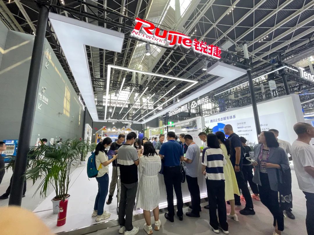 展会现场,锐捷网络展示了全光无线星空解决方案4.0、场景化无线零漫游解决方案、三擎云桌面解决方案、极简以太全光解决方案3.0、高速数据中心解决方案等一系列数字经济领域的创新数字基础设施和数字化解决方案和产品,吸引了各行业领域的专家和客户的驻足与参观。