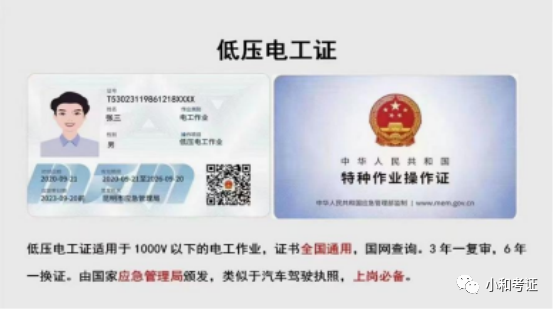 现由国家安全生产监督管理总局颁发(原劳动部、经贸委都曾管理过),由各地安全生产监督管理局负责管理。特种作业操作证每3年需复审1次,6年换证。复审由特种作业人员本人或用人单位在有效期内提出申请,由当地的考核、发证单位负责审验。在有效期内不审核,再想审核是不可能的,只能重新考试。常见的低压电工和高压电工都是由应急管理厅颁发的。