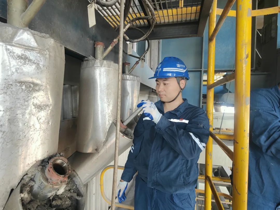 环保专业对5号湿除本体内部喷嘴逐一进行检查疏通,确保喷嘴雾化良好。(作者:李国臣)