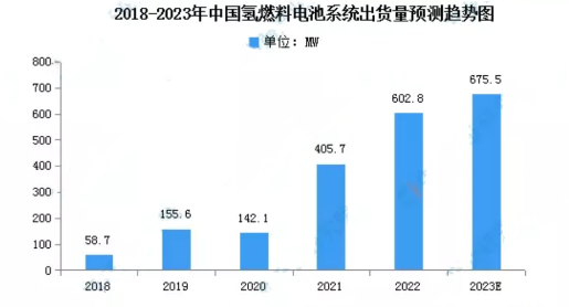 2022年,国内氢燃料电池系统的市场规模约为602.8MW同比增长48.58%,预计2023年将进一步增长至675.5MW。
