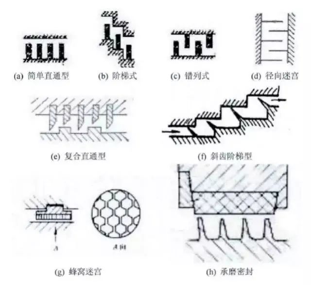 迷宫密封是在转轴周围设若干个依次排列的环行密封齿,齿与齿之间形成一系列截流间隙与膨胀空腔,被密封介质在通过曲折迷宫的间隙时产生节流效应而达到阻漏的目的。迷宫密封是离心式压缩机级间和轴端最基本的密封形式,根据结构特点的不同,可分为平滑式、曲折式、阶梯式及蜂窝式等四种类型。