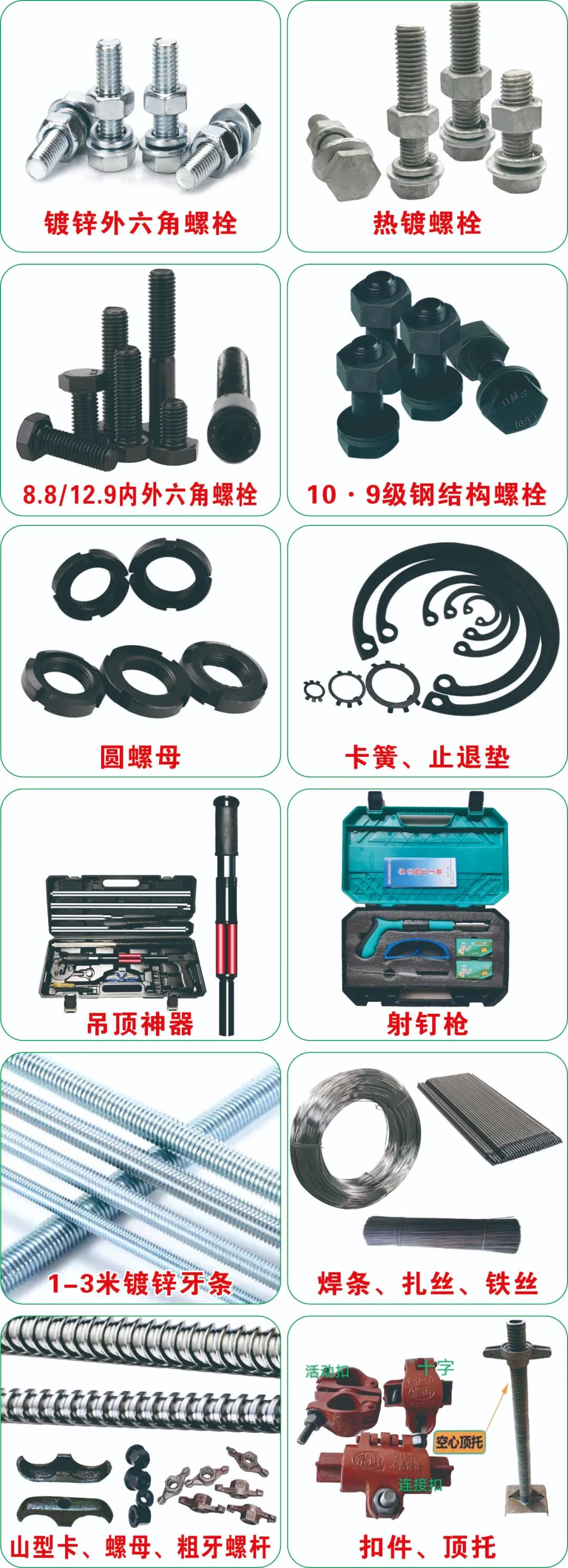 主营:)、内外六角螺丝、镀锌螺丝、膨胀螺丝、双头螺丝、地脚螺丝、沉头螺丝、半圆头螺丝。价格优惠。