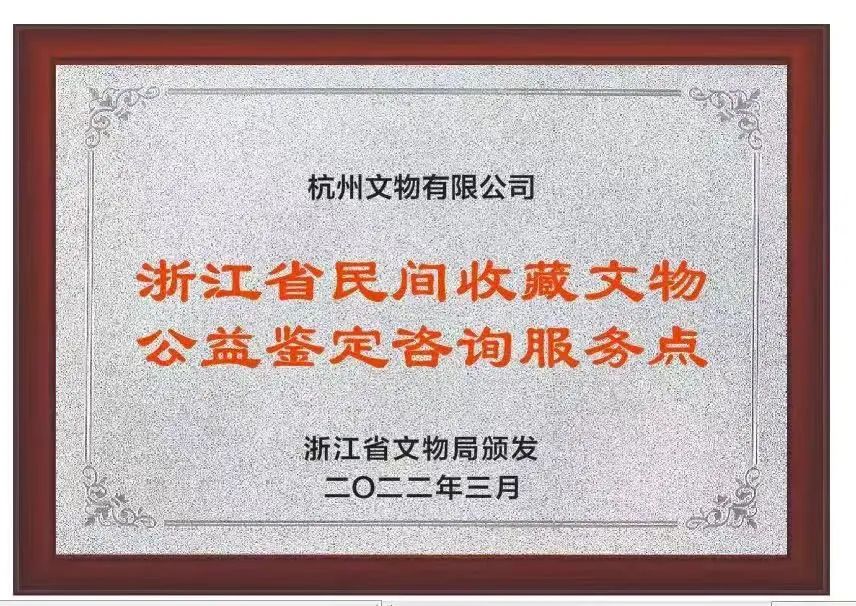 2022年3月,浙江省文物局发文-增设杭州文物有限公司为“浙江省民间收藏文物公益鉴定咨询服务点”,杭州文物公司与浙江省文物鉴定站、浙江省博物馆一起,正式成为浙江省文物局指定“浙江省民间收藏文物公益鉴定咨询服务点”。