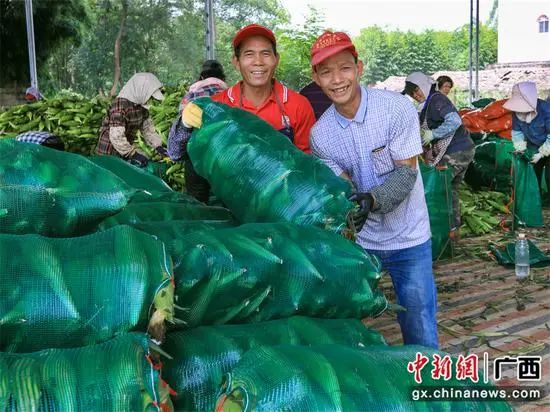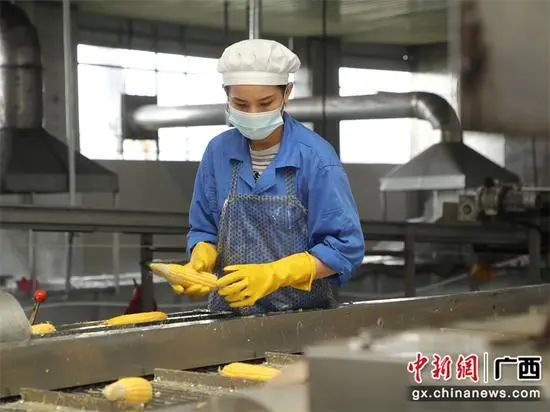 在横州市鑫源果蔬合作社,甜玉米堆成小山,工人们正忙着把新鲜采摘回来的甜玉米进行分类和装袋,一派繁忙的景象。在一旁的深加工生产车间内,空气中满是甜玉米的清香。甜玉米经过清洗筛选后,通过机械传送带进入加工流水线。现场,工人们忙碌地给鲜玉米高温灭菌、真空包装。随后,一箱箱开袋即食甜玉米便从这里源源不断地销往全国各地。