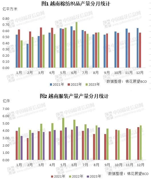 2023年1-8月越南棉纺织品累计产量达4.55亿平方米,同比降幅7.37%;服装累计产量达32.68亿件,同比减幅16.81%。