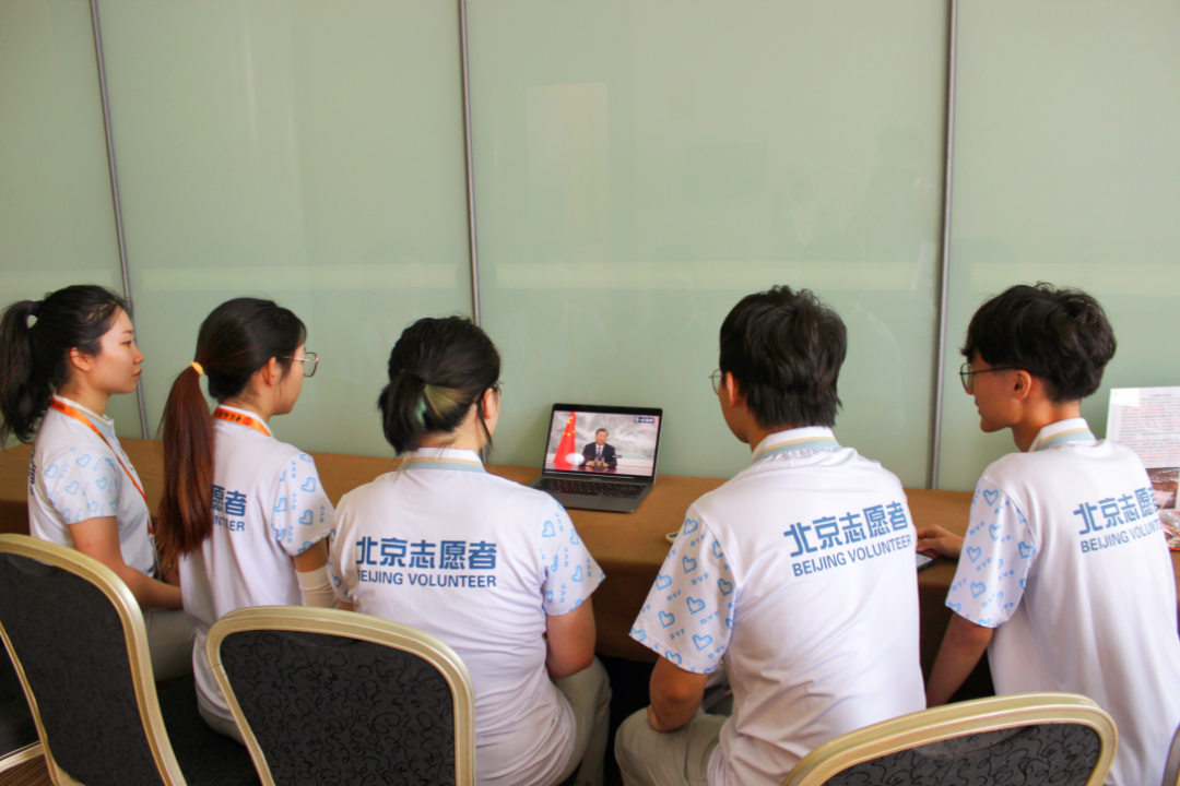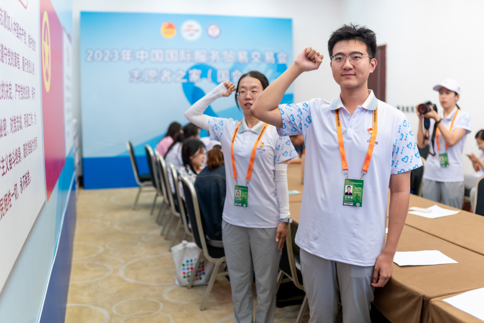 服务期间,首都师范大学服贸会志愿服务队临时党组织开展专题学习活动,学习国家主席习近平在北京向2023年中国国际服务贸易交易会全球服务贸易峰会发表的视频致辞。全体志愿者分组进行学习与交流,共同观看致辞视频、阅读致辞内容,感悟服贸会“开放引领发展,合作共赢未来”的深刻主题,并结合自身所学专业与志愿服务岗位内容,开展深入分享和交流。